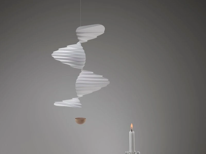 Le mobile Airflow 24 de Flensted Mobiles séduit par son escalier en colimaçon blanc qui tourne joliment au contact d’un courant d’air. Conçu par Carina Caia, le mobile Airflow a été réalisé à partir d’une fine feuille de sérigraphie blanche et d’une demi-sphère en bois suspendue en dessous.