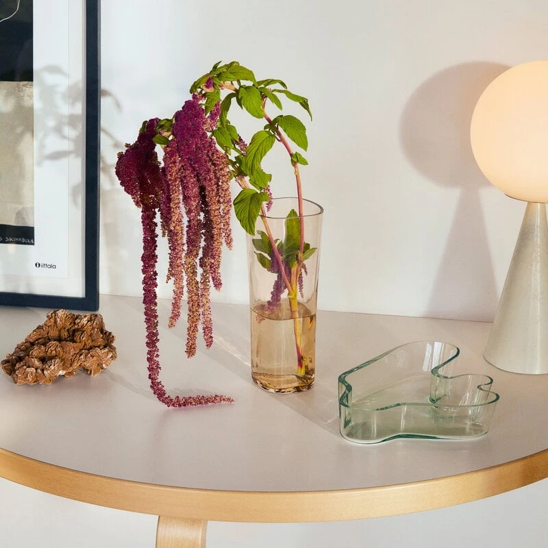 Bien que ce vase ait un aspect quelque peu différent de la forme organique du vase Aalto classique, il appartient à la même collection de verrerie qu’Alvar Aalto a créée pour l’exposition universelle de Paris en 1937. Les vases Aalto sont aujourd’hui conçus dans une gamme de couleurs et de modèles différents.