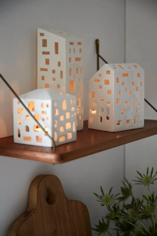 Les lanternes Urbania de Kähler offrent une alternative moderne aux lanternes plus traditionnelles en forme de maison. Les lanternes en céramique, conçues par Mette Bache et Barbara Bendix Becker, représentent une variété de bâtiments où la lumière des bougies, reflétée par des fenêtres de formes diverses, crée des motifs fascinants dans leur environnement.