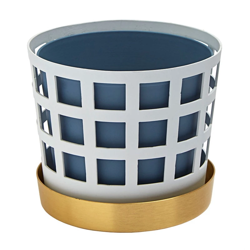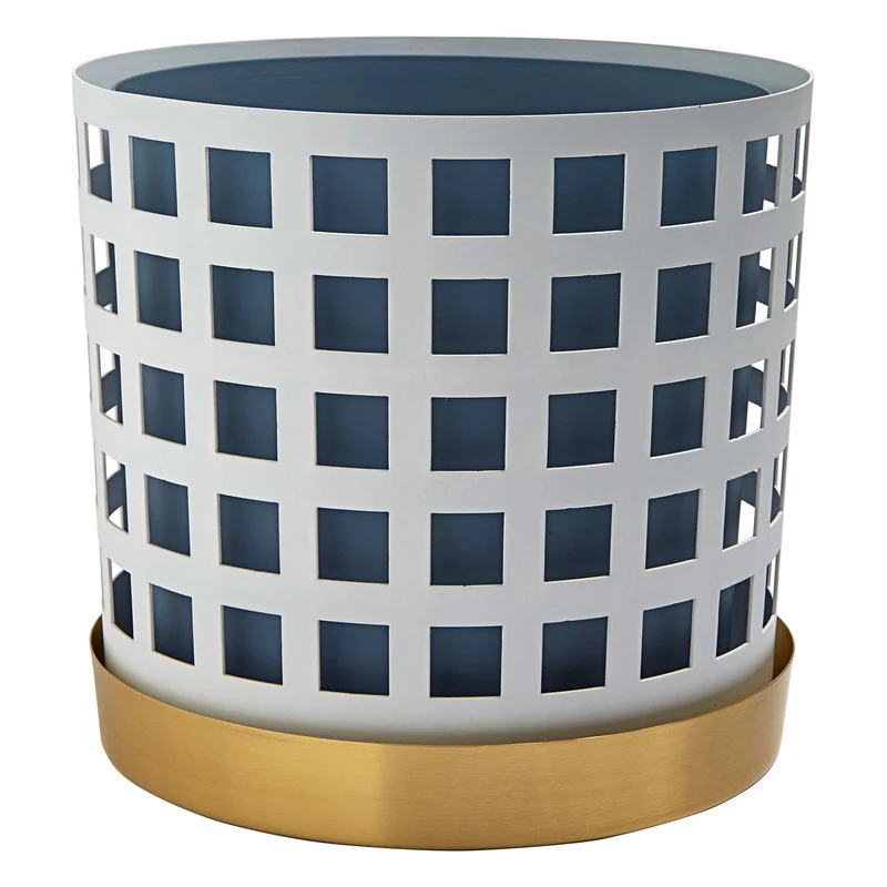 Le pot de fleurs Trio de Klong se compose de trois éléments différents : un pot intérieur bleu, une couche d’acier aux motifs perforés et un plateau en laiton laqué. Conçus par Ania Pauser, les pots Trio créent un contraste intrigant avec les plantes vertes et les différentes tailles et couleurs de la collection s’accordent à merveille.